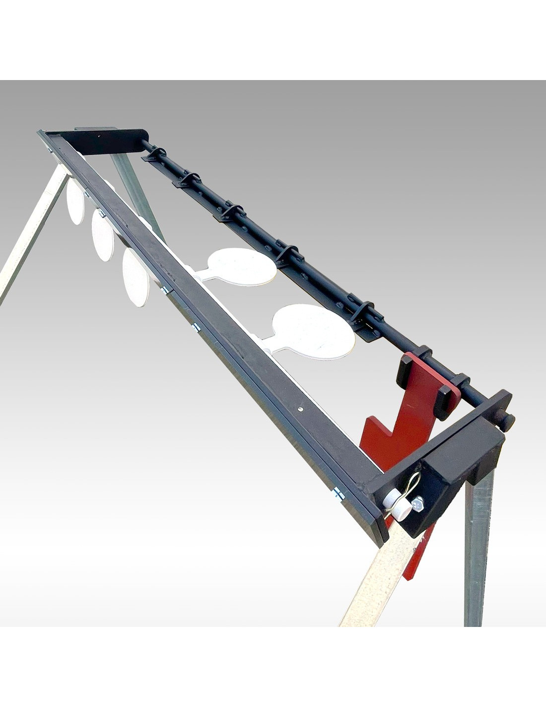 Arbre de tir automatique horizontal blindé de 5 cibles de tir dynamique rotation à l'impact, cibles diamètre 150mm, livré avec portique complet avec douilles renforcées, blindage Hardox 600 8mm